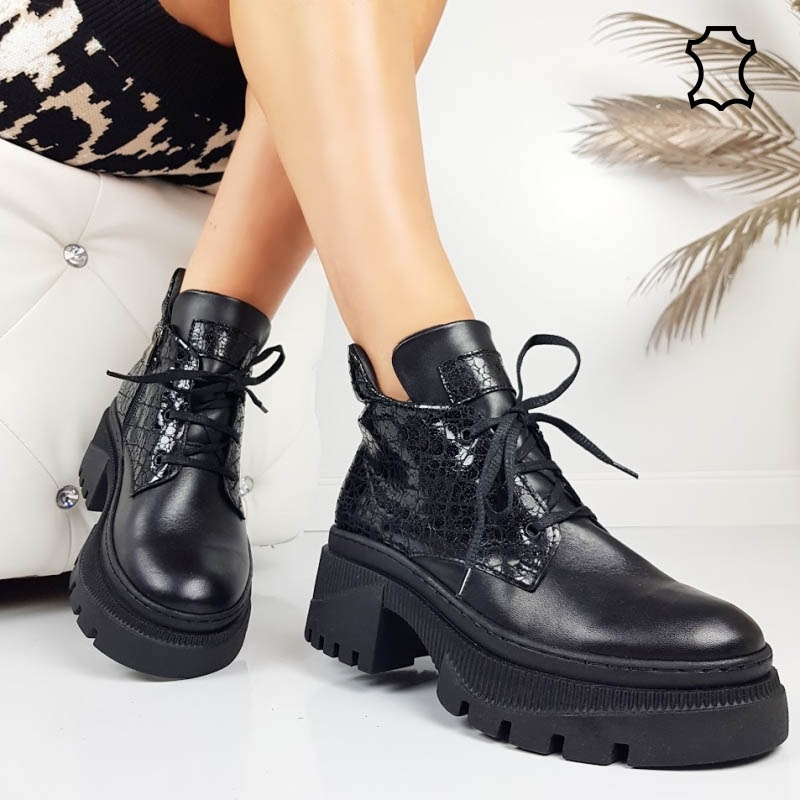 Черни боти от естествена кожа на платформа- Sandra Black 11447