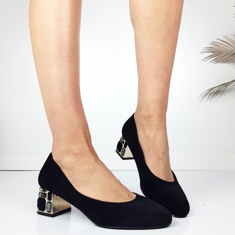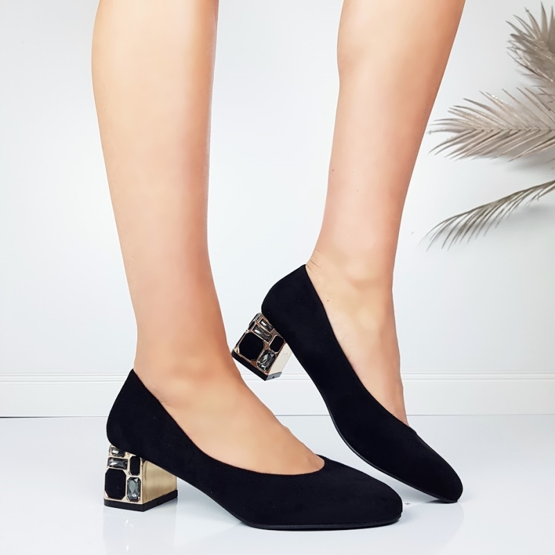 Елегантни велурени обувки с ефектен ток с камъни- Arina Black 11542